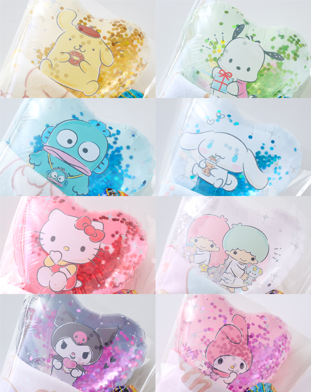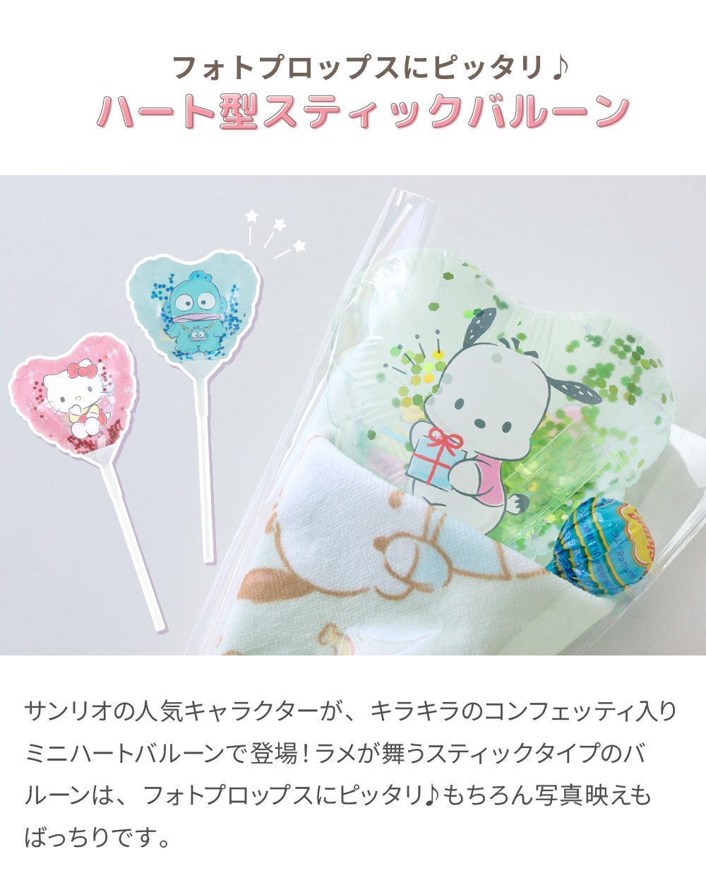 サンリオの仲間たちのバルーンに、ミニタオルハンカチとチュッパチャプスを組合わせたプチサイズのアレンジバルーンブーケです。程よい大きさで、大人にも子どもたちにもオススメ!