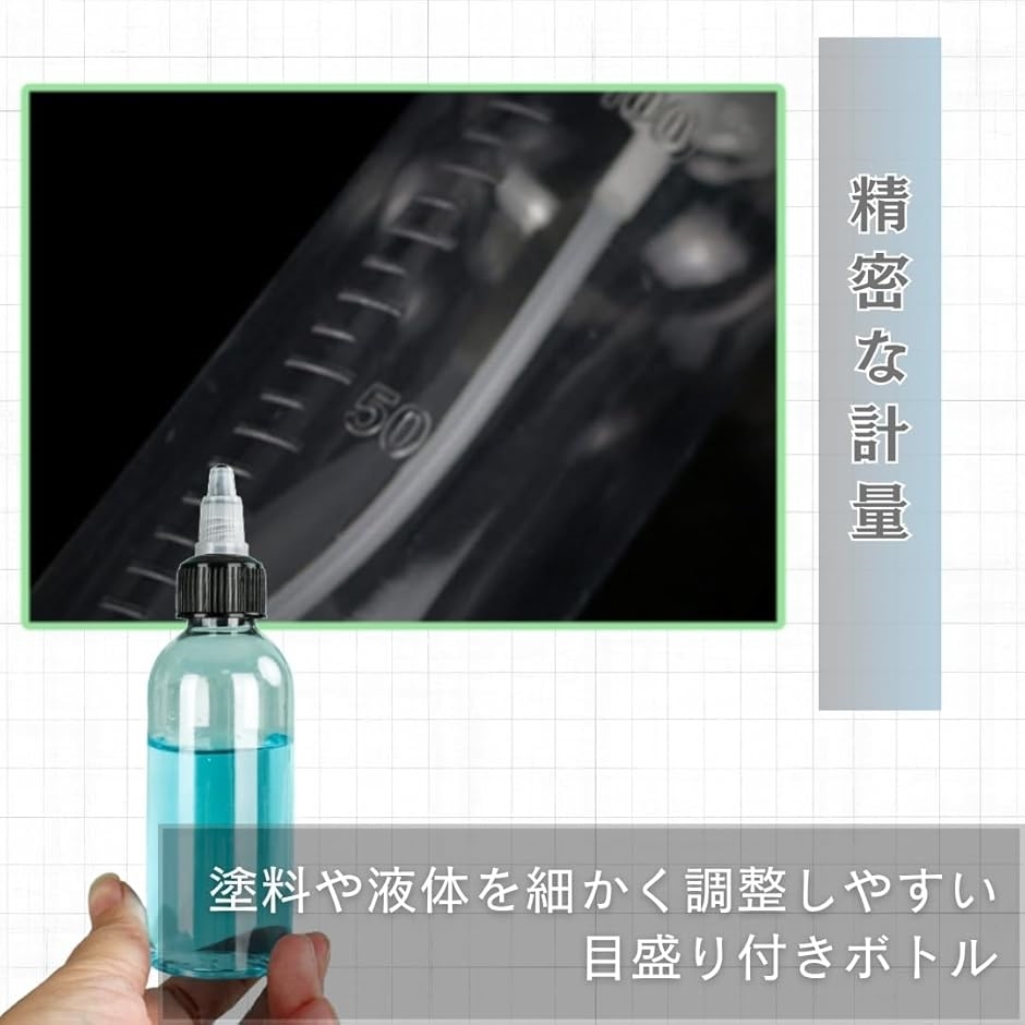 「精密な計量」目盛り付きボトルにより、塗料や液体を細かく調整しやすくなっています。