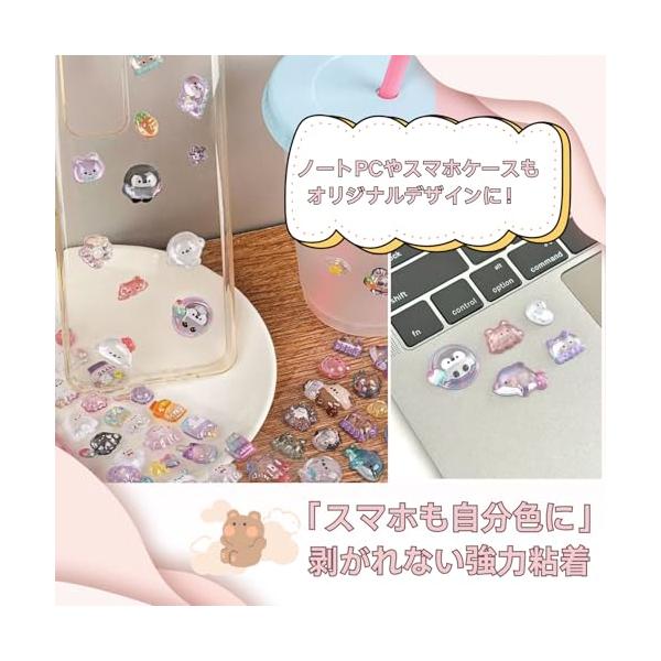 1. 高品質3D立体デザイン 可愛いうさぎ、くま、ドーナツなど多様なデザインがぷくぷくと立体的に飛び出します プレミアムPVC素材使用で、手帳やスマホケースを一気に華やかに変身させます。