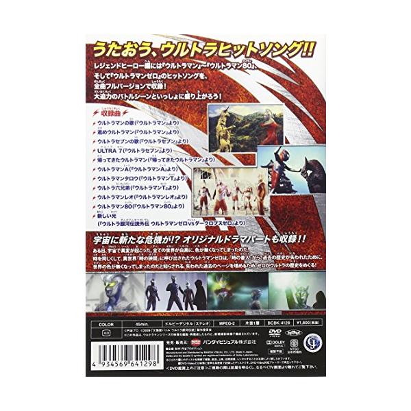 ウルトラマンシリーズ45周年記念DVD! ウルトラ戦士と大怪獣とのバトルシーンが、懐かしい&最新のヒットソングにのせて繰り広げられる! ウルトラマンゼロと歴代ウルトラ戦士が共演する新撮ドラマパートも収録! 45年の歴史を、代表的ヒットソングで振り返る! ☆★☆内容★☆★ 【収録内容】 シリーズ歴代ヒットソングをフルバージョンで収録! 各楽曲を名バトルシーンの再編集映像と共に楽しめる“うたパート”と、今や人気No 1! ウルトラマンゼロと歴代ウルトラ戦士が共演する“新撮ドラマパート”で、ウルトラマンシリーズ45年の歴史振り返る! <収録曲(※全てフルバージョンで収録)> ○ウルトラマンの歌(『ウルトラマン』より) ○進めウルトラマン(『ウルトラマン』より) ○ウルトラセブンの歌(『ウルトラセブン』より) ○ULTRA 7(『ウルトラセブン』より) ○帰ってきたウルトラマン(『帰ってきたウルトラマン』より) ○ウルトラマンエース(『ウルトラマンエース』より) ○ウルトラマンタロウ(『ウルトラマンタロウ』より) ○ウルトラ六兄弟(『ウルトラマンタロウ』より) ○ウルトラマンレオ(『ウルト