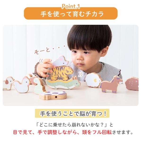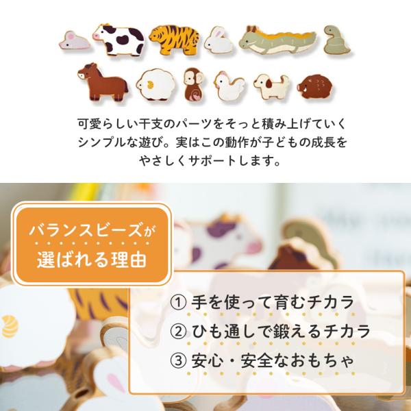 12種類の干支の動物たちが大集合した、見た目にも楽しい木製玩具です。それぞれ形の異なる動物を積み上げるバランスゲームとして、ひとりでも、友達や兄弟とでもハラハラドキドキしながら遊べます。全てのパーツには穴が開いているため、ひも通し遊びとしても活用でき、手先の器用さや集中力を育む知育効果も期待できます。さらに、動物を順番に並べることで自然と干支の並びを覚えられ、遊びながら日本の文化に触れられる点も魅力です。お正月には縁起物として飾ることもでき、インテリアとしても可愛らしい存在感を発揮します。ギフトにもぴったりの、長く楽しめる木のおもちゃです。