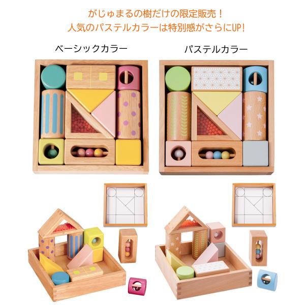 木目が見えるやさしい色の塗装がされた、全ブロック音入りのつみき。丸・三角・四角それぞれに異なる音の仕掛けが入っていて、積み木の中が見えるブロックでその動きを楽しむことができます。 中が見えない積み木には、どんな仕掛けが入っているか想像する力も自然と養われるおもちゃ。見て楽しい、振って楽しい、積んで楽しい積み木。きれいな色と心地良い音が、情緒を豊かに育みます。つみやすい大きめのサイズのブロックでラトル代わりにもなるので、「はじめてのつみき」として出産祝いや誕生日プレゼントにおすすめです。積み木のお片付けもパズルみたいに楽しめる木箱付。音いっぱいつみきは当店オリジナル名入れ無料サービス付き。出産祝いや誕生日プレゼントも、名前入れで特別な贈り物になります。
