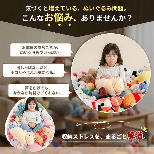ぬいぐるみ収納に集めて、詰めて、座れる。
