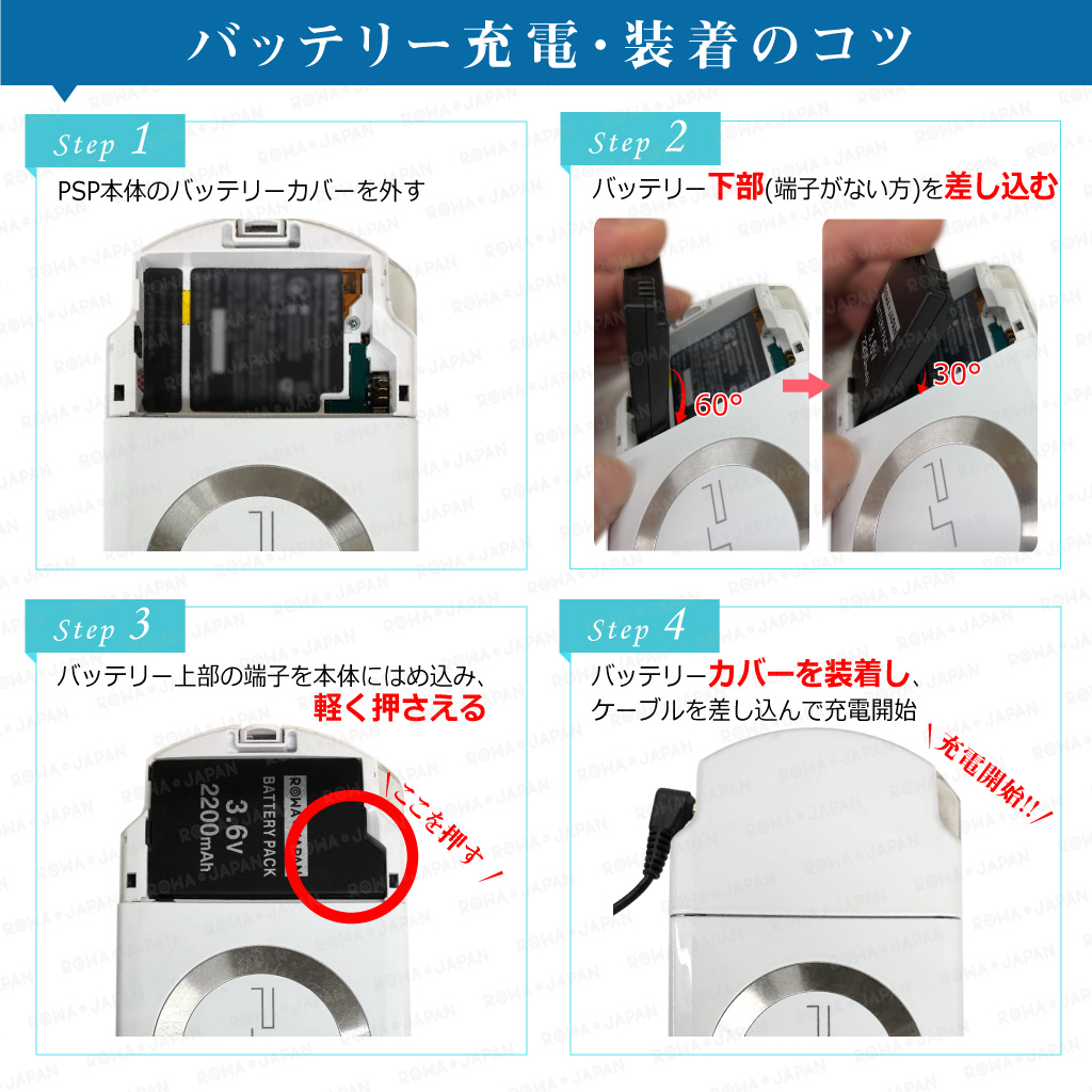 ※電池装着後、蓋が閉まらない等の場合、ご使用PSPが対応機種ではない可能性がございます。対応機種をよくご確認ください。